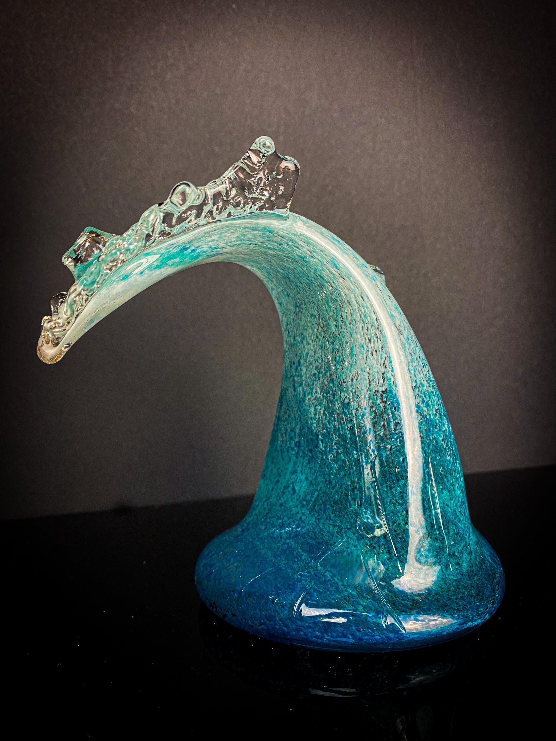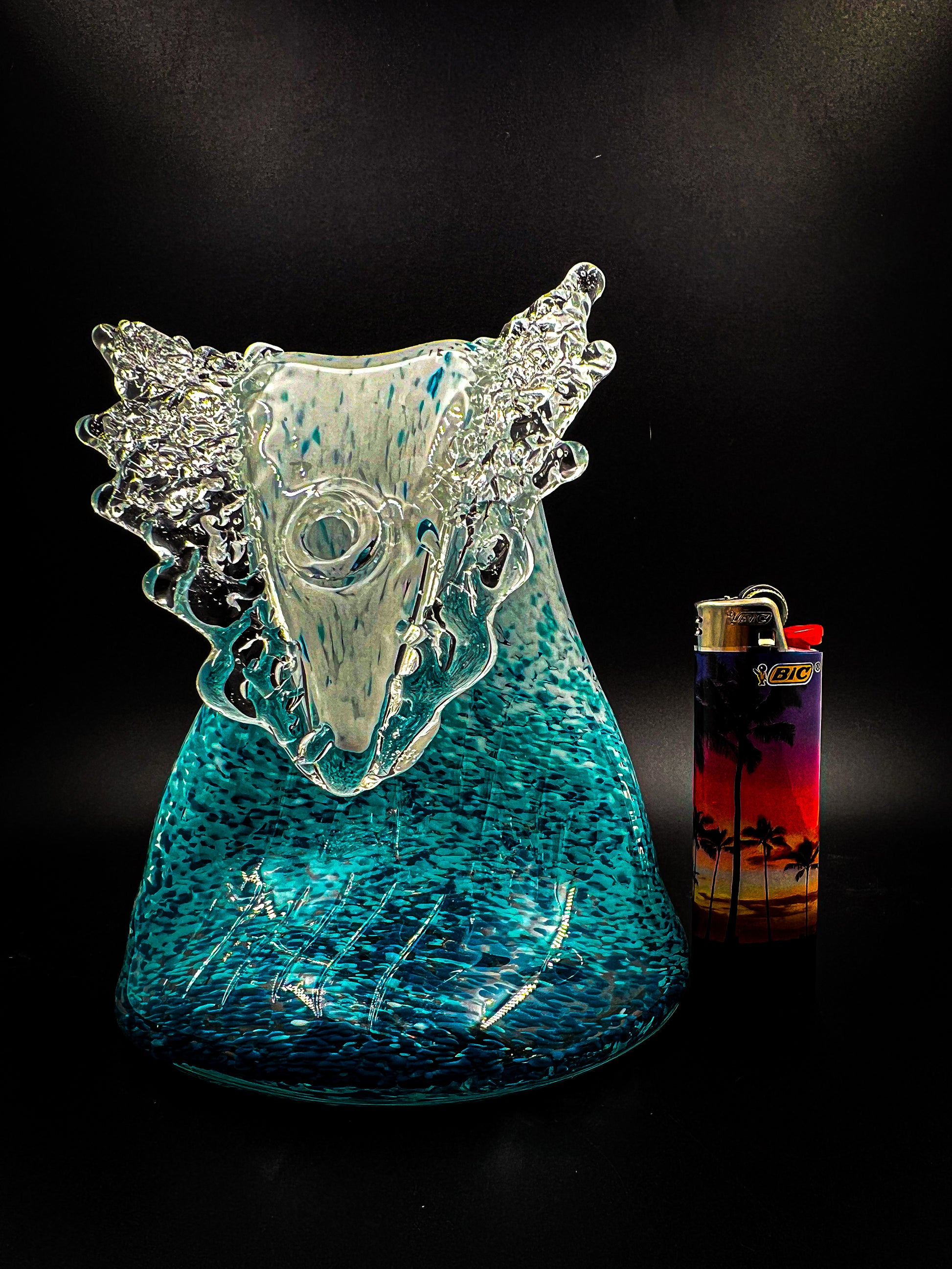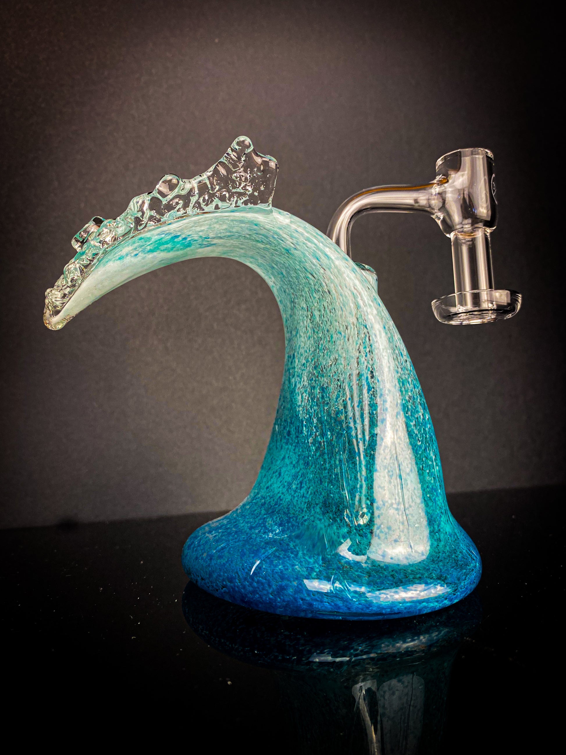 This is my classic colored wave, it’s a white to light & dark blue fade. Made using the inside out frit technique to mimic the large soft glass sculptures of waves. My unique design makes for a smooth rip with no water in your mouth.