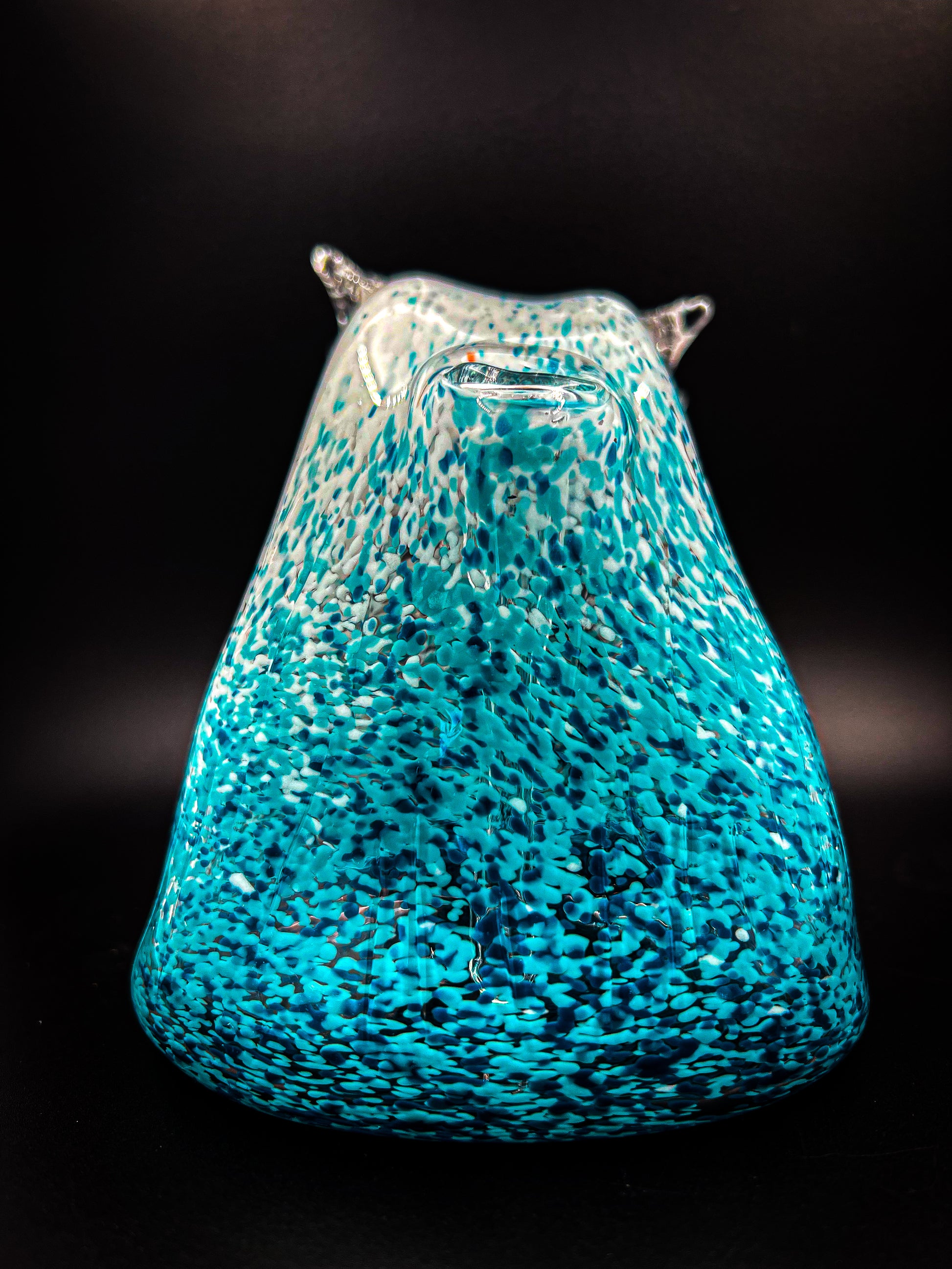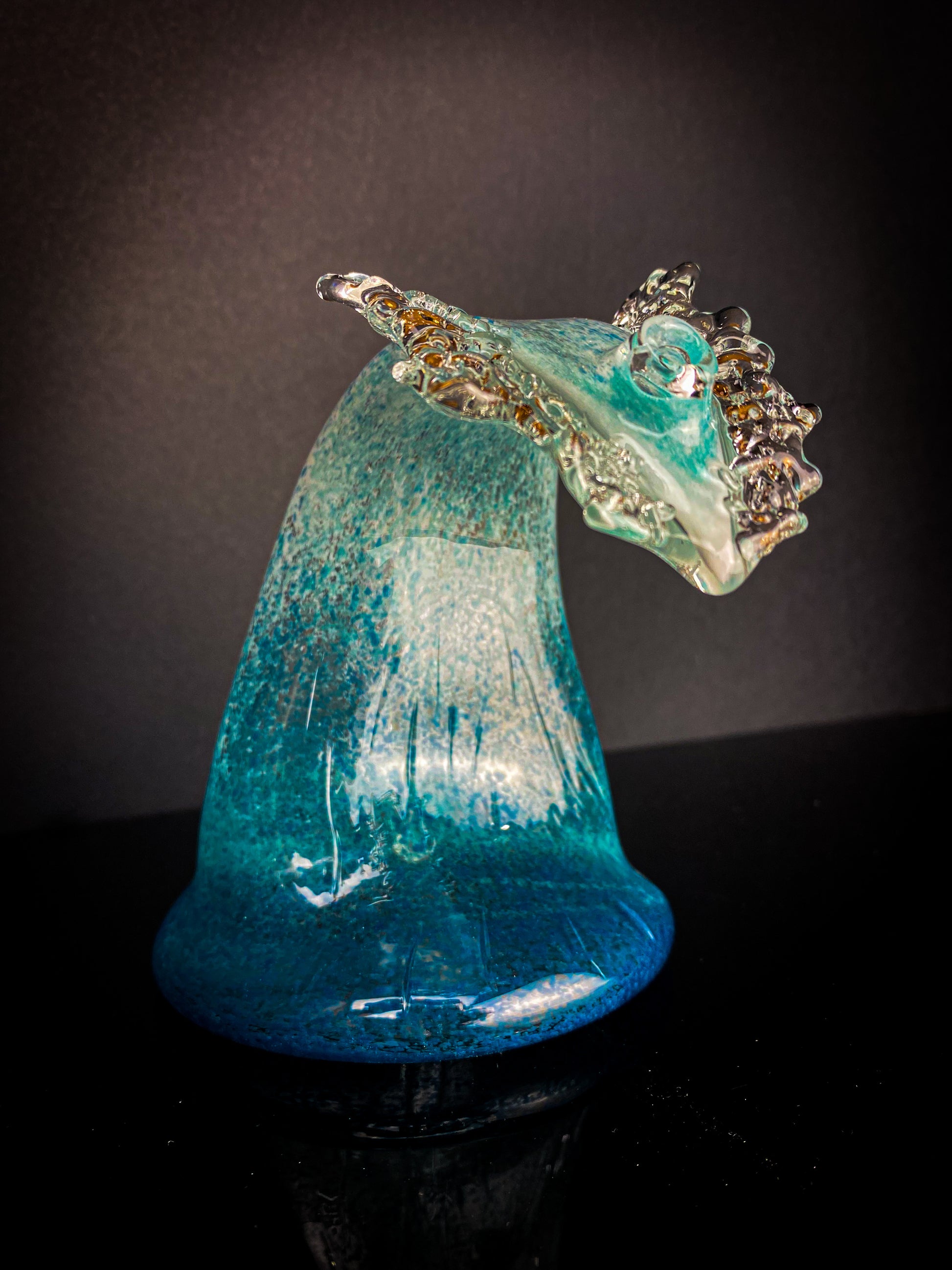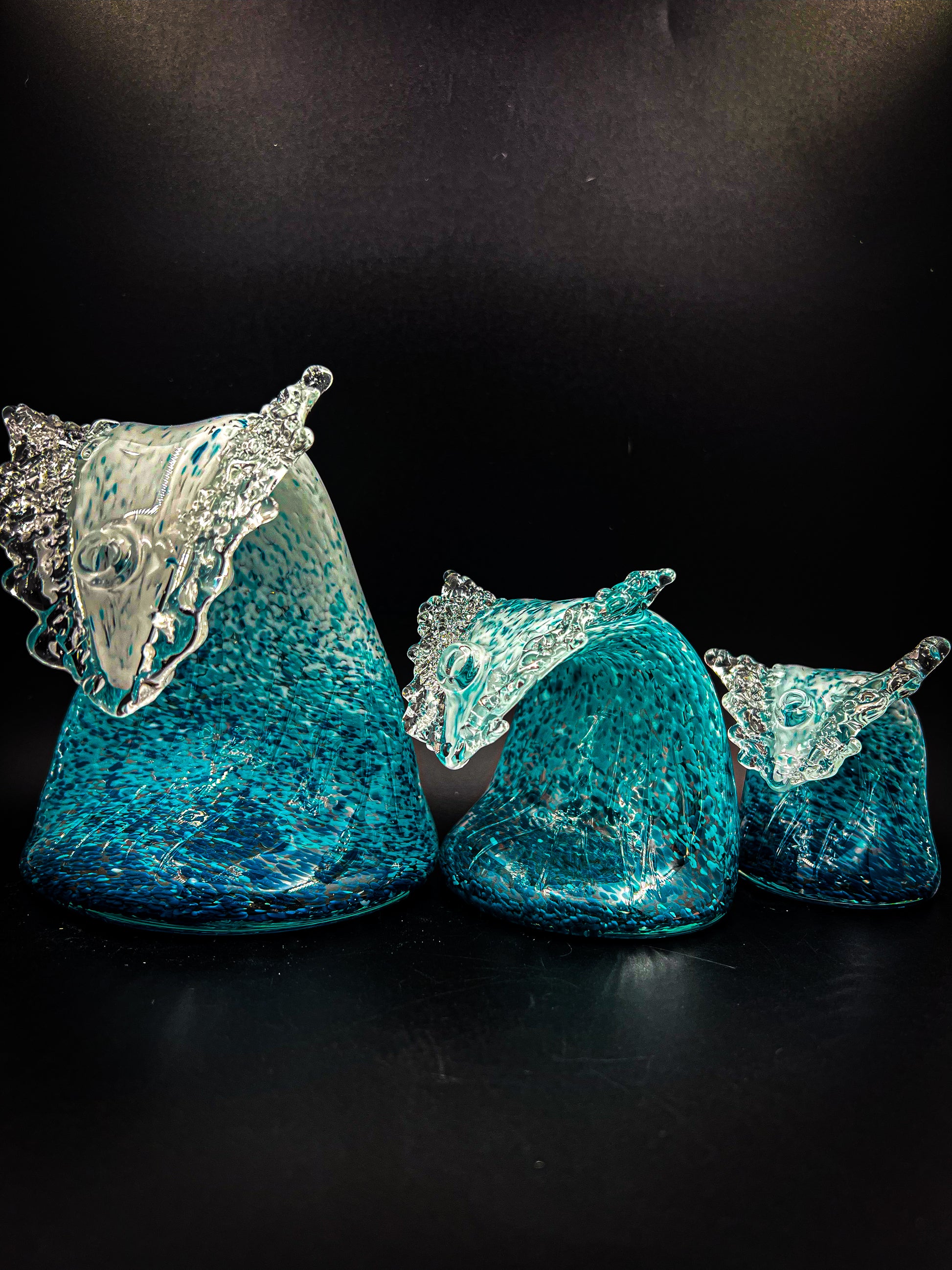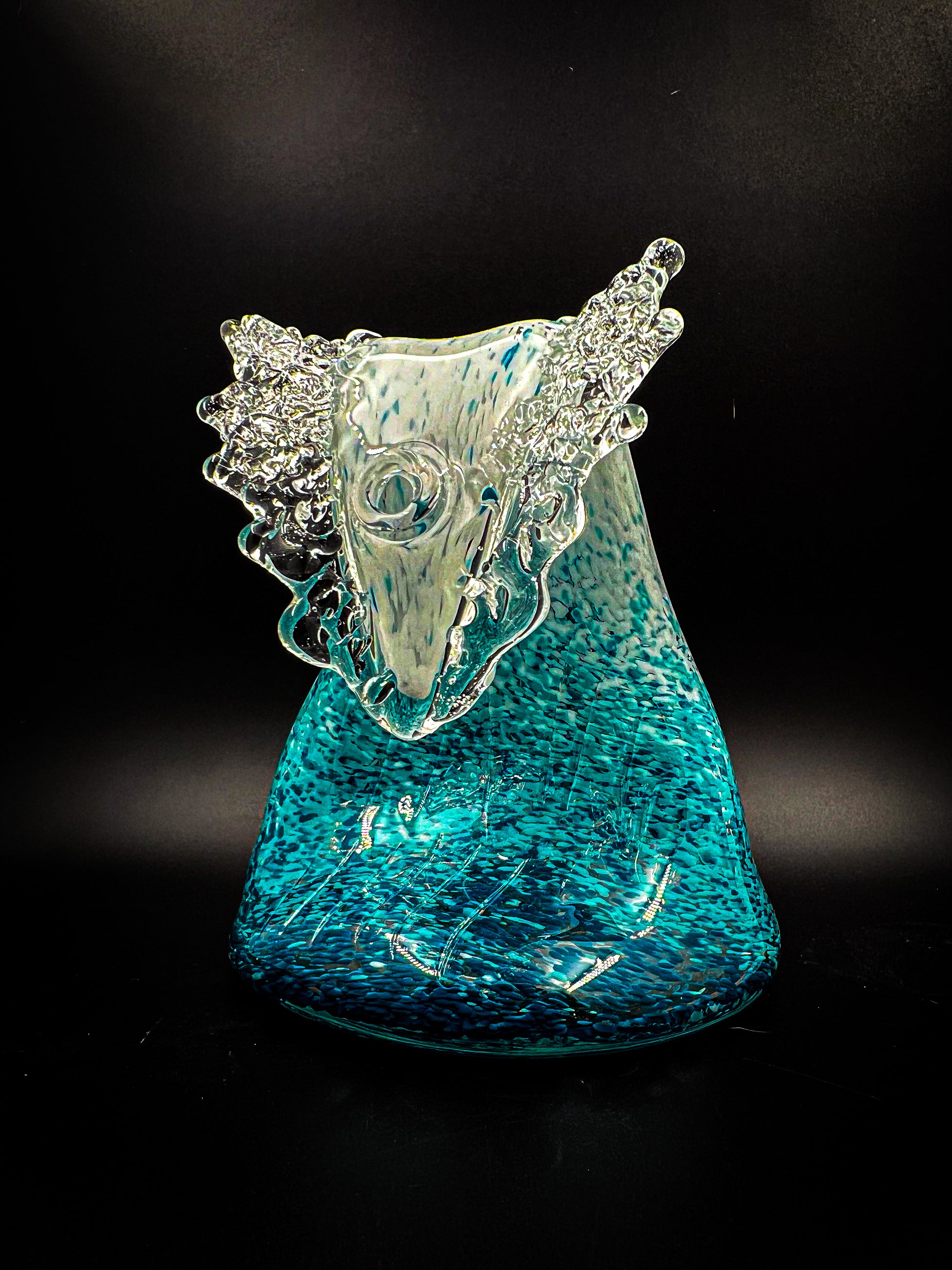 This is my classic colored wave, it’s a white to light & dark blue fade. Made using the inside out frit technique to mimic the large soft glass sculptures of waves. My unique design makes for a smooth rip with no water in your mouth.